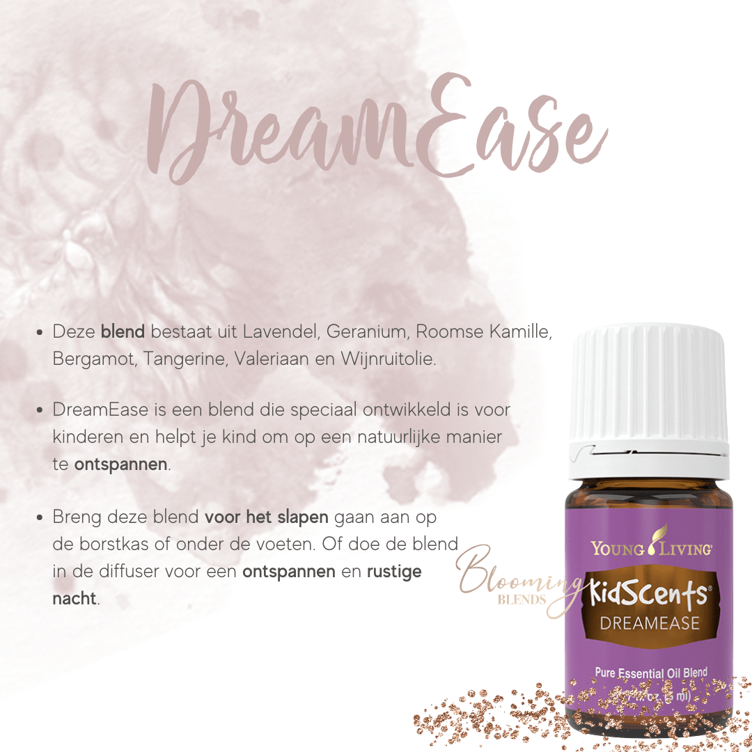 DreamEase is een kalmerende essentiële olieblend die helpt om kinderen vanaf 2 jaar te ontspannen en heerlijk te slapen, met een zachte, dromerige geur voor in de diffuser.